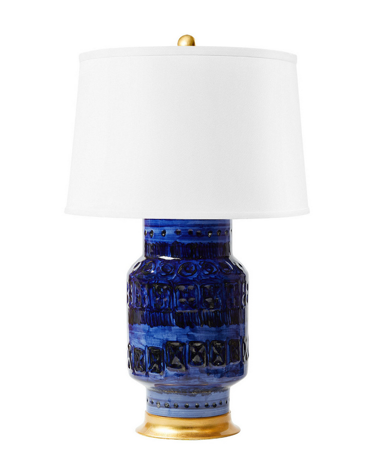 Aristide Lamp with Shade 17-inch White Linen, with Gold, Royal Blue
